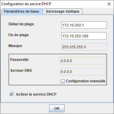 Configurez le service DHCP pour distribuer les adresses comprises entre 172.16.250.1 à 172.16.250.199 avec le masque 255.255.255.0