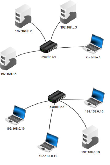 Ajoutez un deuxième réseau composé des 3 portables et d'un PC reliés entre eux par un nouveau Switch S2. (Ne modifiez pas leur adresse IP et conservez l'adresse par défaut proposée 192.168.0.10 et utilisez l'adresse IP comme nom.)