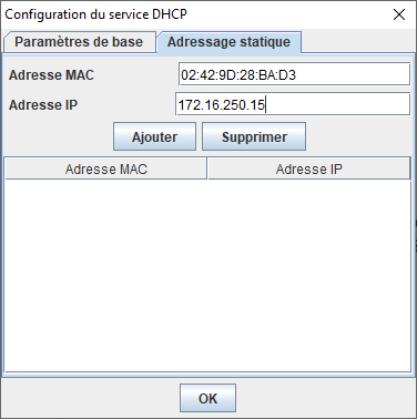 Dans le champ Adresse IP choisir l'adresse IP souhaitée (Ex: 172.16.250.15)